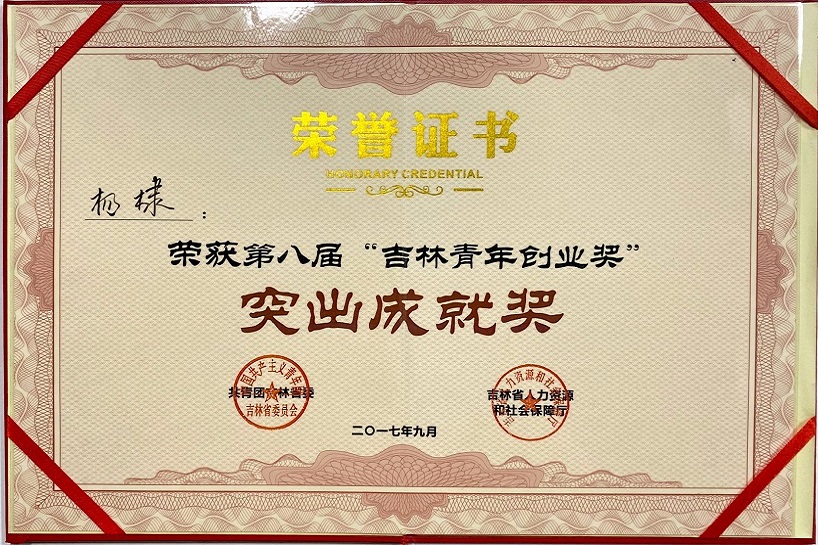 2017年荣获第八届“吉林青年创业奖”突出成就奖
