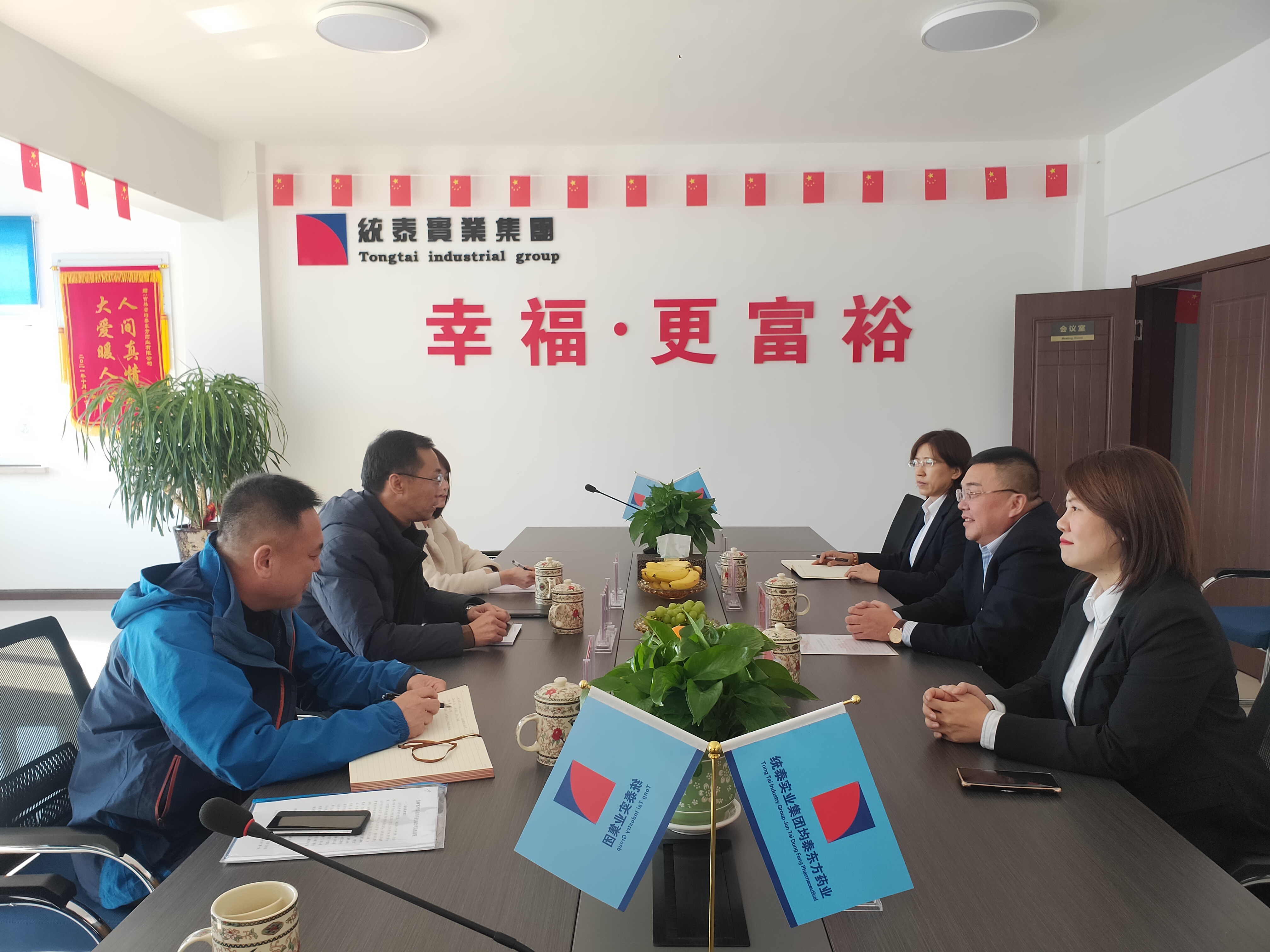 2021年11月13日,桦甸经济开发区新任书记赵国峰带领桦甸经济开发区管委会副主任周斌、桦甸经济开发区发展与改革经济局(规划建设局)局长姜丹等领导,来到统泰实业投资集团子公司—吉林省均泰东方药业有限公司开展专题调研并召开座谈会。领导一行人此行为了了解桦甸医药产业发展现状,倾听药企发展心声,为我市医药产业做大做强汇智聚力。统泰实业投资集团董事长杨棣、集团商业板块总裁兼桦甸公司总经理张艳、业务副总于钦秀、销售经理刘坤、团支部书记李佳等出席座谈会。
