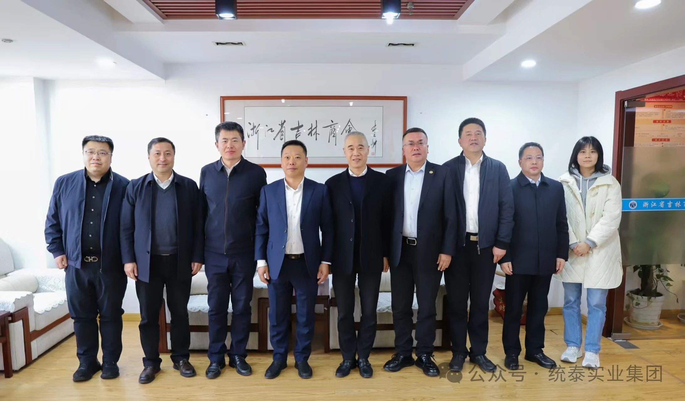 图一:杨棣董事长(右四)与考察团一行在浙江省吉林商会合影留念