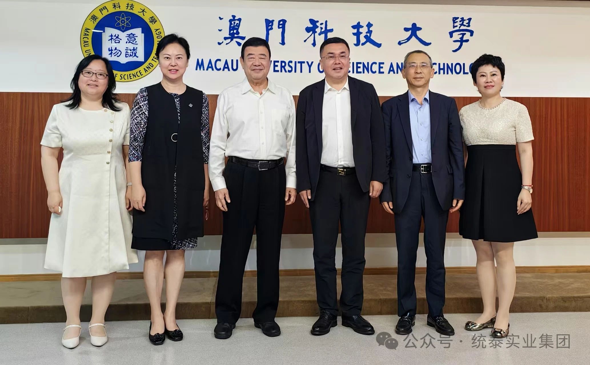 图二:统泰集团董事长杨棣(右三)一行与澳门科技大学董事长、校监廖泽云(左三),副校长兼国家中药重点质量实验室主任姜志红(右二),校董兼秘书长陈季敏(左二)合影留念。