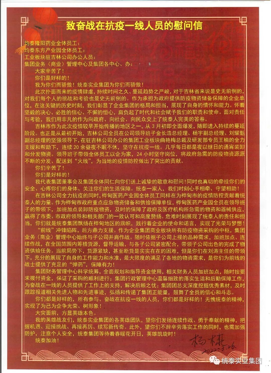 统泰实业集团董事长杨棣致集团所有奋战在抗疫一线人员的慰问信