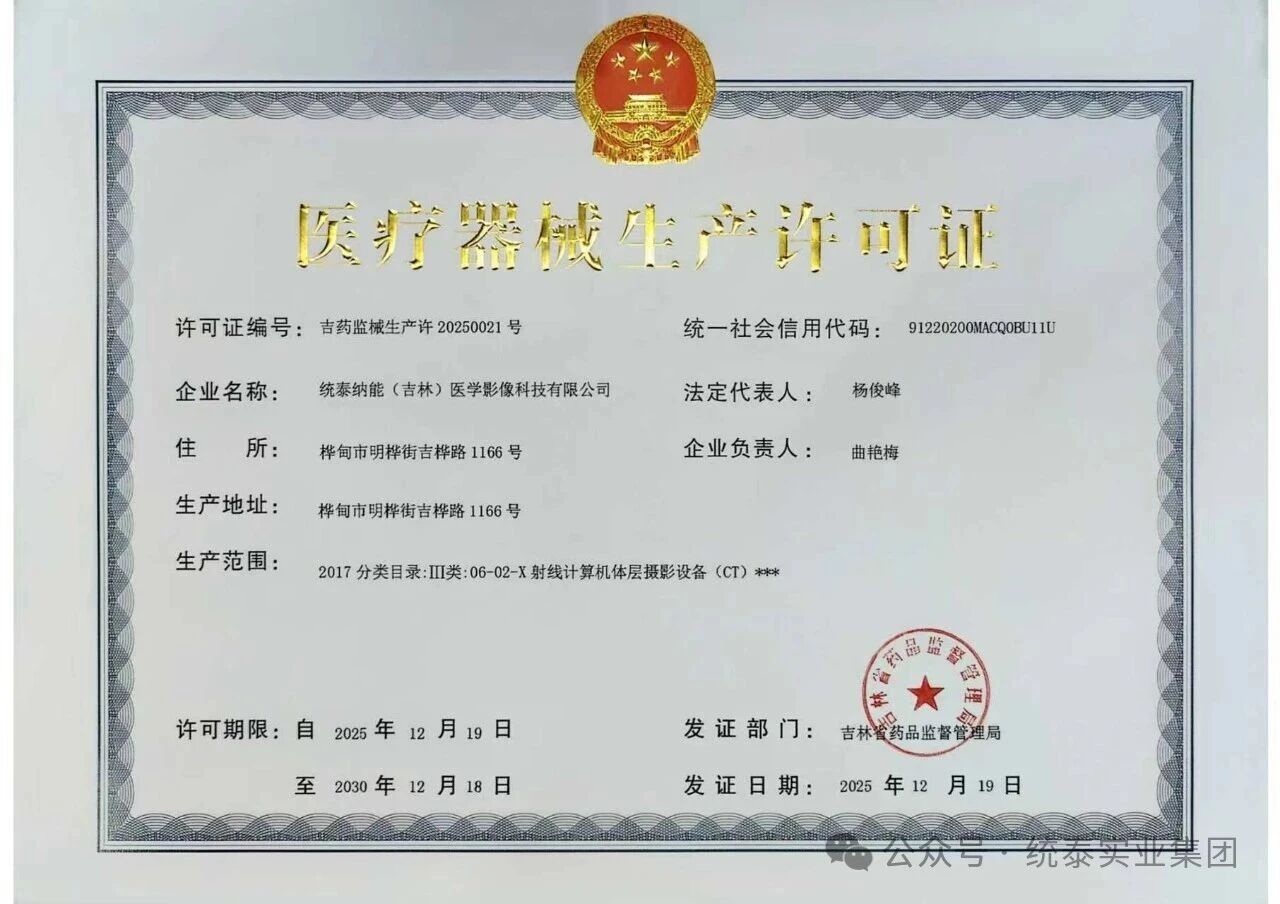 近日,统泰集团旗下统泰纳能(吉林)医学影像科技有限公司(以下简称“统泰纳能”)传来重磅喜讯——经过吉林省药品监督管理局(以下简称“省药监局”)严格的材料审核与现场核查,成功通过医疗器械生产许可核查,正式荣获省药监局颁发的《医疗器械生产许可证》,使统泰纳能成为省内首家生产医学影像医疗器械的企业,极大填补了吉林省在该领域的空白。