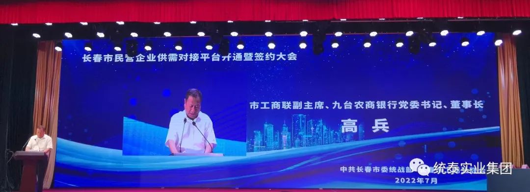 为深入贯彻落实党中央、国务院推进社会发展工作相关决策部署,长春市委统战部、市工商联组织建立了长春市民营企业供需对接平台,为我市民营企业提供更高效的服务。2022年7月6日为平台签约大会,优秀民营企业、市工商联副主席、统泰集团董事长杨棣应邀莅临会议。会议由市委统战部副部长、市工商联党组书记任宏雷主持,其间由长春市委副书记、市长王子联及市工商联主席、副主席等领导分别发表了讲话,盼景平台服务企业,企业借平台稳步发展。